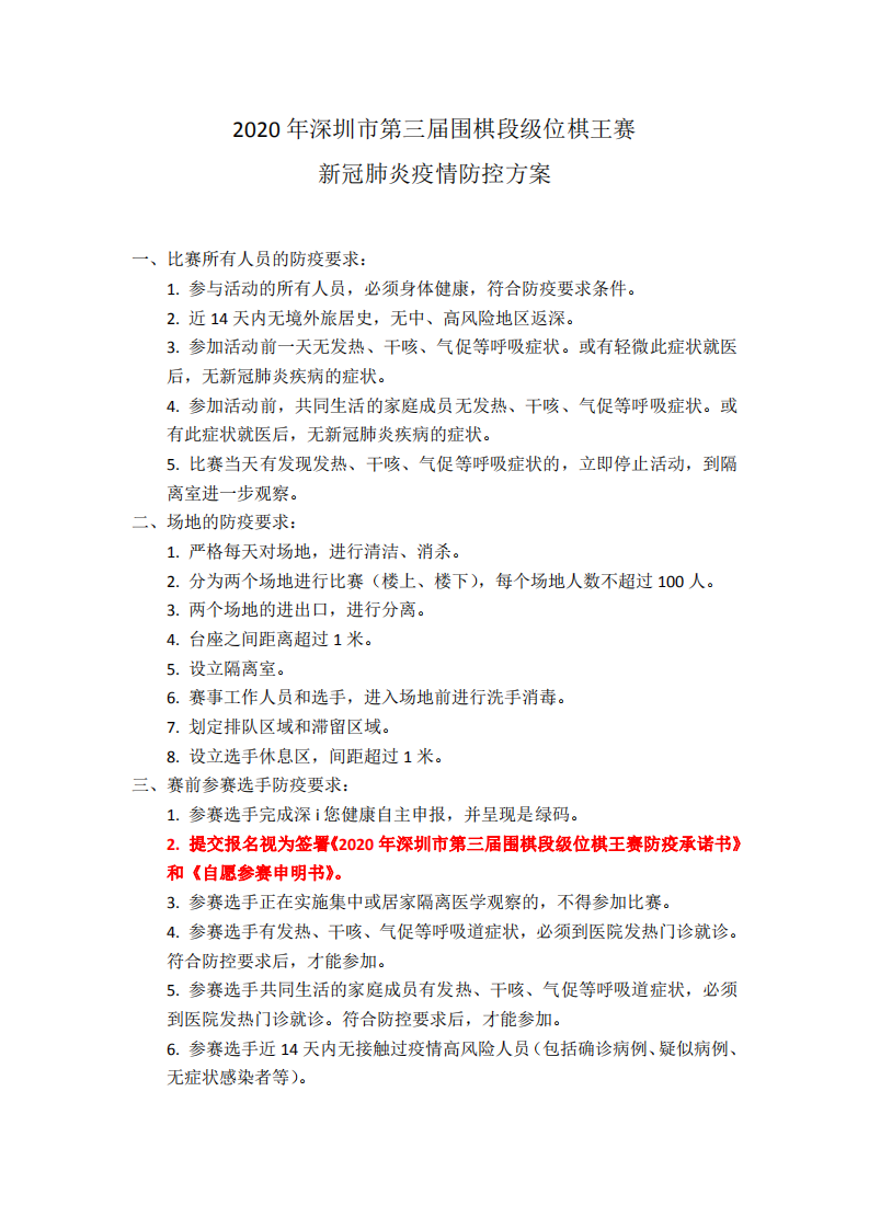 十五、根据国家和深圳市关于新冠肺炎疫情防控的工作部署和要求,本次比赛将严格落实各项防疫措施,赛场严格按照相关要求进行消毒,所有裁判和工作人员均符合身体健康要求。